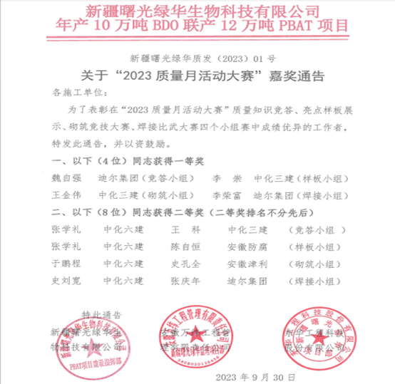 2023年9月30日下午,業(yè)主新疆曙光綠華生物科技有限公司聯(lián)合監(jiān)理安徽萬緯工程管理有限責(zé)任公司、總包東華工程科技股份有限公司及分包單位共同組織開展了“2023質(zhì)量月活動大賽”。