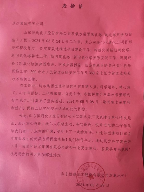為此,山東恒通化工股份有限公司雙氧水分廠代表建設(shè)單位特發(fā)此函,表示衷心感謝!迪爾人積極主動、務(wù)實(shí)高效、銳意進(jìn)取的工作作風(fēng)給我們留下了深刻的印象,受到上下一致的好評。對迪爾恒通項(xiàng)目部在參建過程中的優(yōu)異表現(xiàn)提出表揚(yáng)!我們相信今后,通過雙方務(wù)實(shí)高效的工作,我們和迪爾集團(tuán)有限公司的合作會更加愉快、前景將更加寬闊!祝愿雙方的明天更加輝煌燦爛!