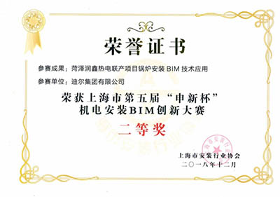 2018年12月,上海市第五屆“申新杯”BIM機電安裝BIM創(chuàng)新大賽結果出爐,迪爾集團有限公司參賽作品《菏澤潤鑫熱電聯(lián)產(chǎn)項目鍋爐安裝BIM技術應用》斬獲BIM創(chuàng)新大賽二等獎。