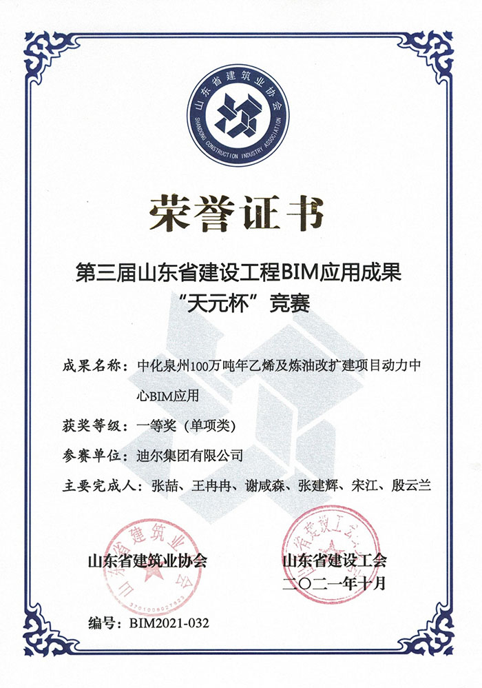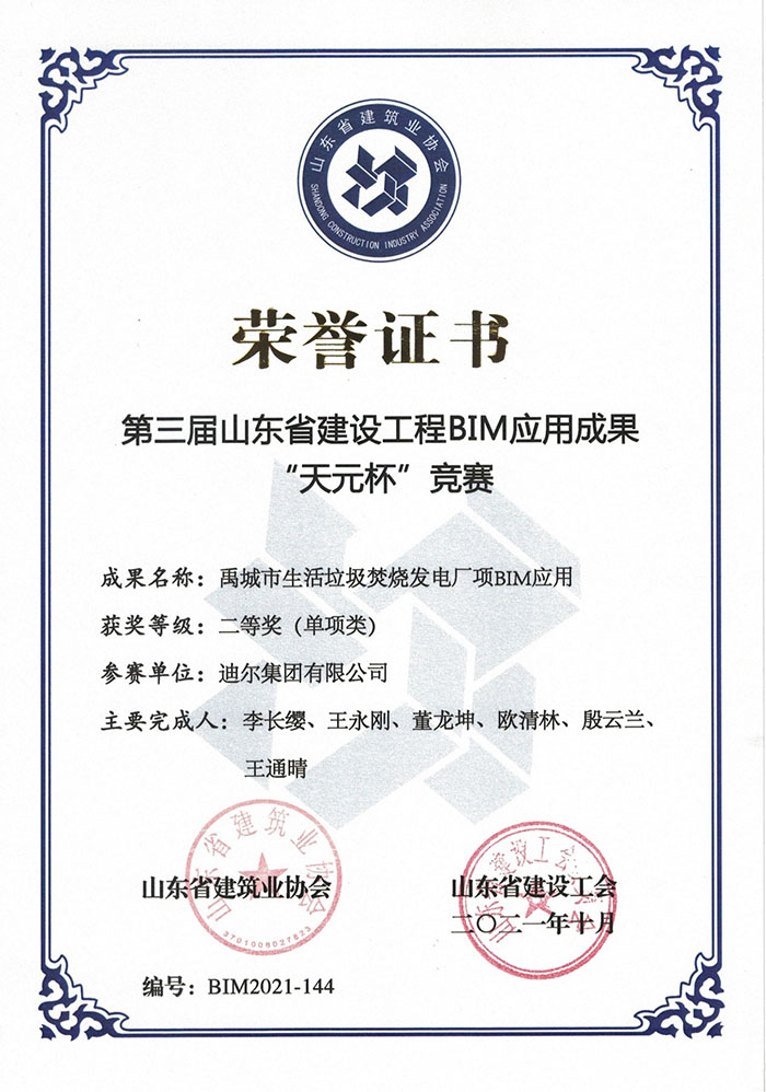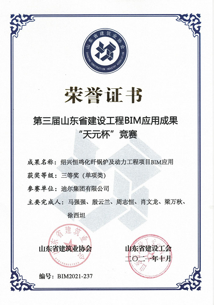 山東省建設工程BIM應用成果“天元杯”競賽由山東省建設工會和山東省建筑業(yè)協(xié)會聯(lián)合舉辦,旨在促進BIM技術在我省建筑行業(yè)廣泛深入應用,培養(yǎng)高水平BIM技術應用人才,加快BIM技術的自主創(chuàng)新和工程實踐。迪爾集團堅持智慧建造和綠色發(fā)展,時刻踐行“做社會進步的智造者”的社會性理念。此次榮譽的取得,是對公司自主創(chuàng)新能力的進一步肯定,公司將在今后的發(fā)展道路中,再接再厲,不斷提升BIM技術深化應用能力,為BIM技術在工程建設領域的推廣做出更大貢獻。