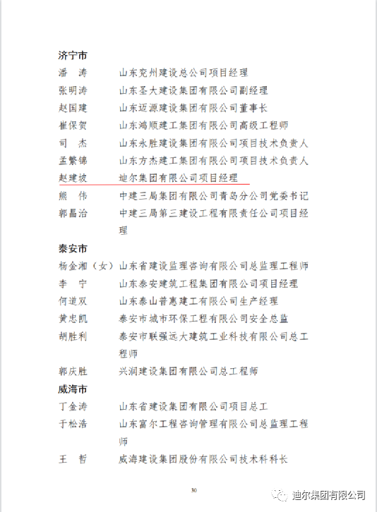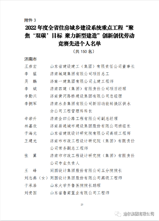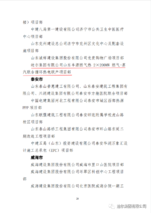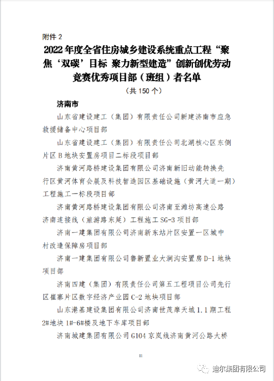 2022年12月28日,山東省住房和城鄉(xiāng)建設廳、中共山東省委省直機關(guān)工作委員會、山東省總工會聯(lián)合發(fā)布文件,迪爾集團有限公司在 2022年度全省住房城鄉(xiāng)建設系統(tǒng)重點工程“聚焦‘雙碳’目標 聚力新型建造”創(chuàng)新創(chuàng)優(yōu)勞動競賽中獲評“先進集體”榮譽稱號;迪爾集團山東豐源燃氣熱 2×200MW 燃氣-蒸汽聯(lián)合循環(huán)熱電聯(lián)產(chǎn)項目部獲評“優(yōu)秀項目部(班組)”榮譽稱號;公司員工趙建坡獲評“先進個人”榮譽稱號。
