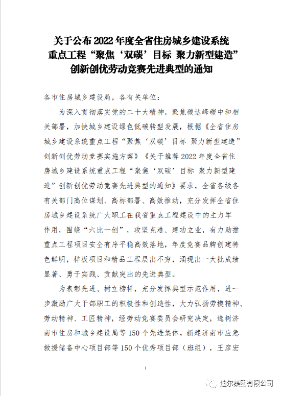 迪爾集團獲評2022年度全省住房城鄉(xiāng)建設系統(tǒng)重點工程“聚焦‘雙碳’目標 聚力新型建造”創(chuàng)新創(chuàng)優(yōu)勞動競賽“先進集體”榮譽稱號