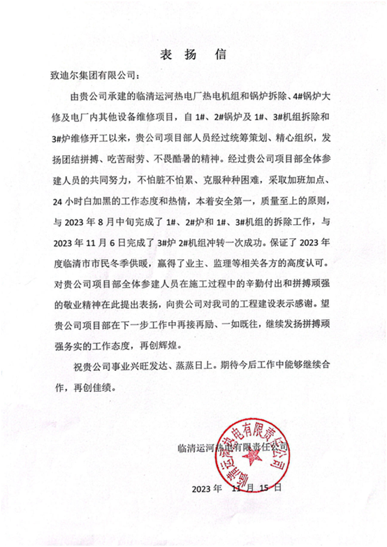 2023年11月6日11時(shí)10分,由迪爾集團(tuán)承建的臨清運(yùn)河熱電項(xiàng)目2#機(jī)組沖轉(zhuǎn)一次成功。