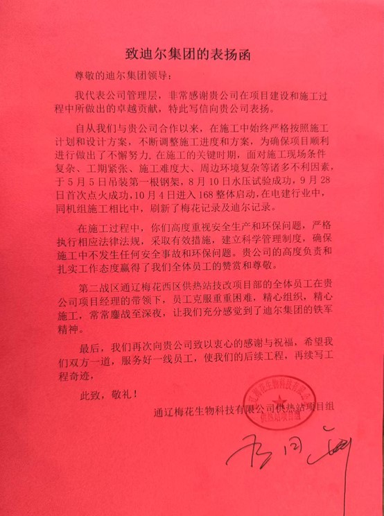 金秋碩果,獻(xiàn)禮國慶。由迪爾集團(tuán)第二公司承建的通遼梅花西區(qū)供熱站技改項(xiàng)目,于2024年9月28日點(diǎn)火一次成功,于10月4日順利進(jìn)入168小時(shí)整體試運(yùn)行,受到業(yè)主的高度贊揚(yáng)。
